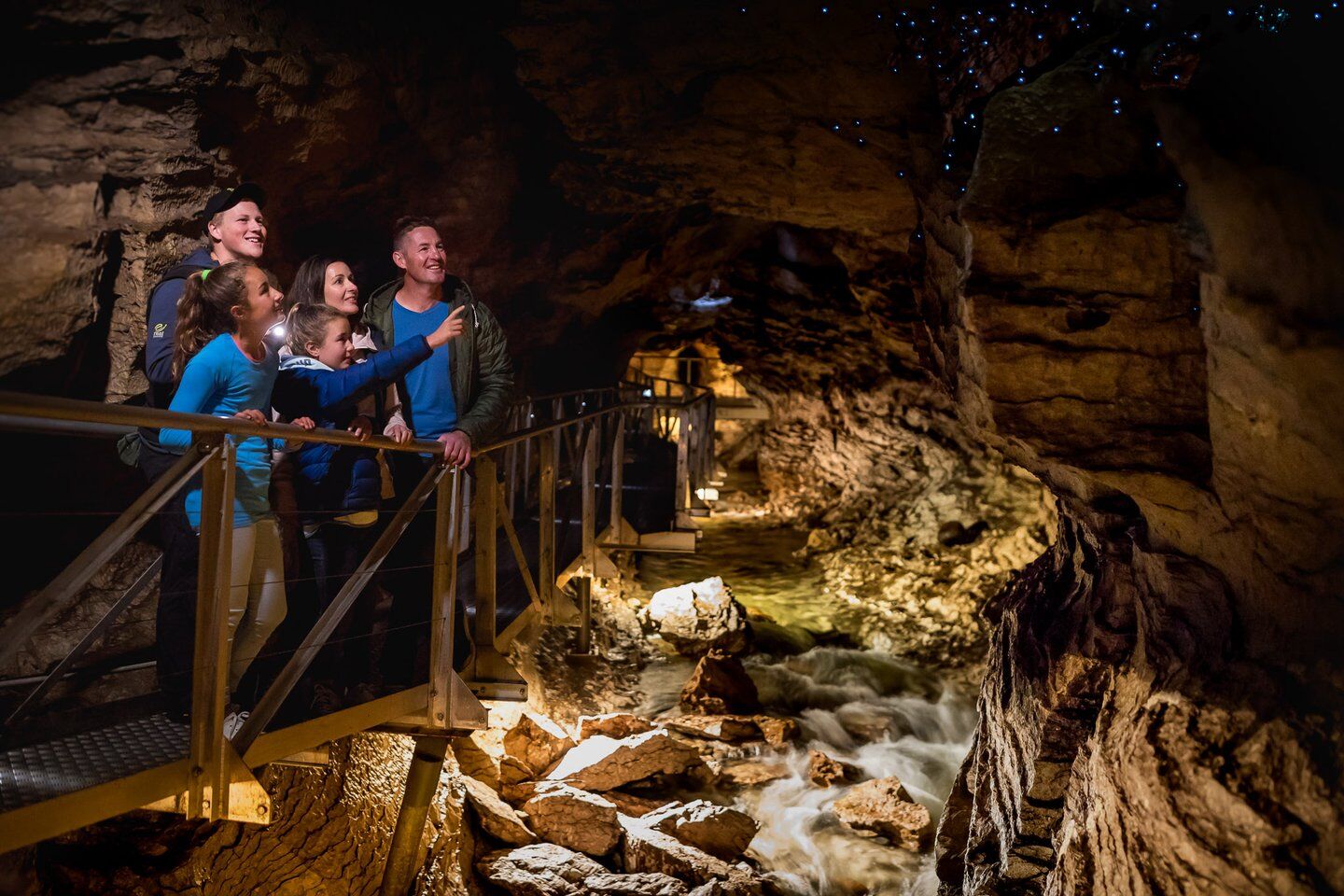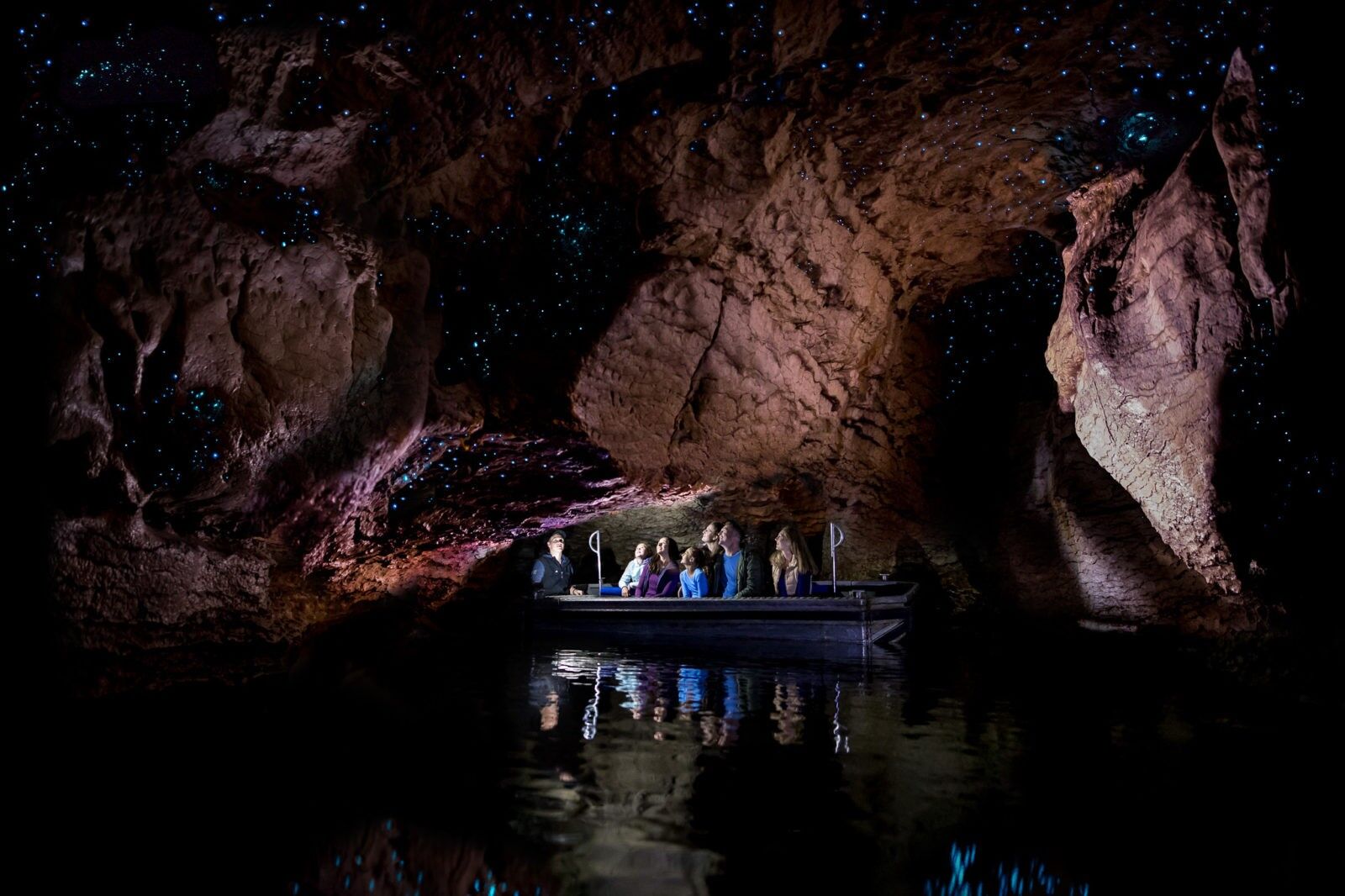 Experience a mysterious underground world with a guided cave tour past the rushing water of an underground stream before drifting in silent darkness beneath the luminous shimmer of hundreds of glowworms.