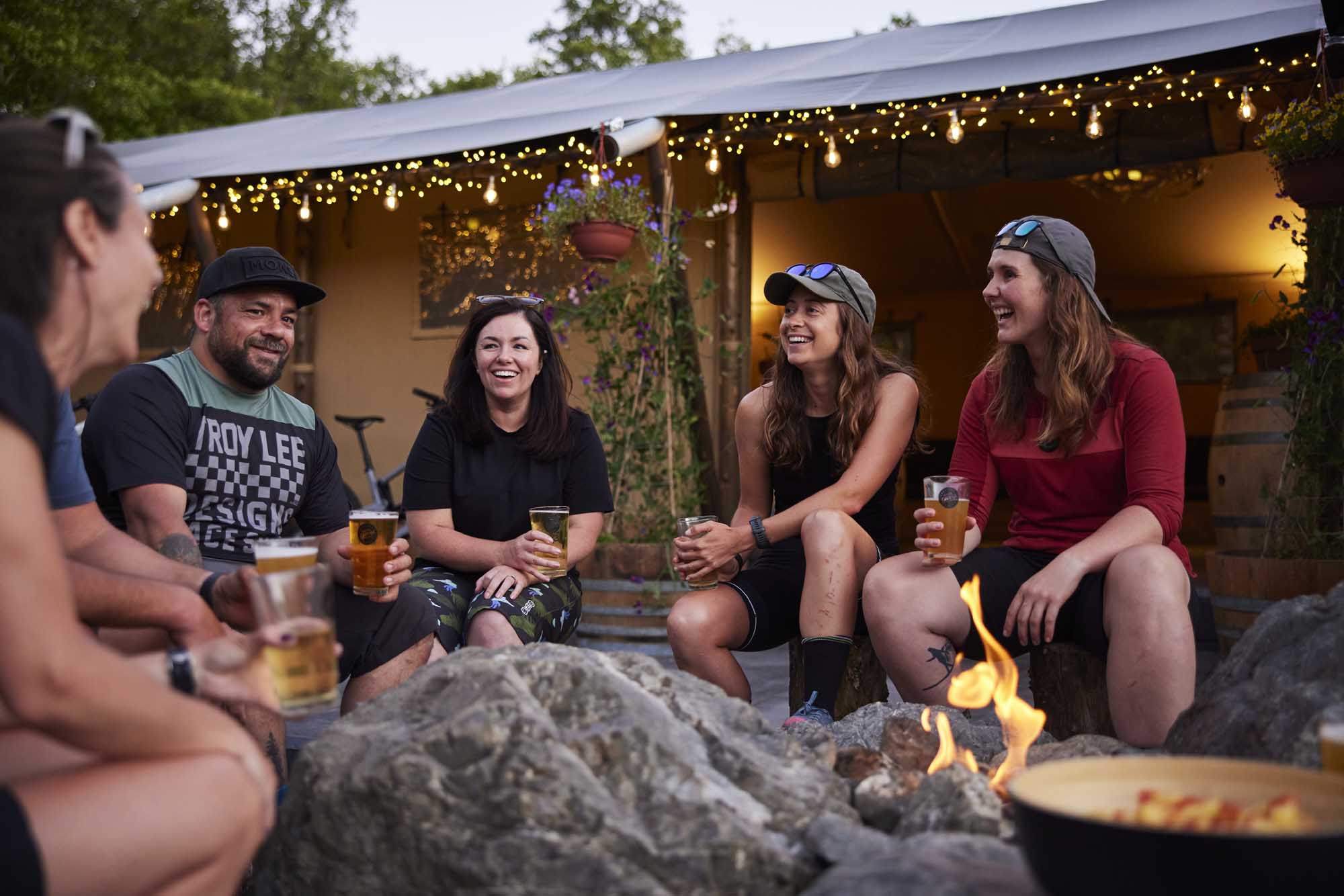 Have a bite to eat, play lawn games and enjoy the outdoor campfires, or unwind with a “Shinny Dip” in the cute foot hot tubs, free with any drinks purchase.