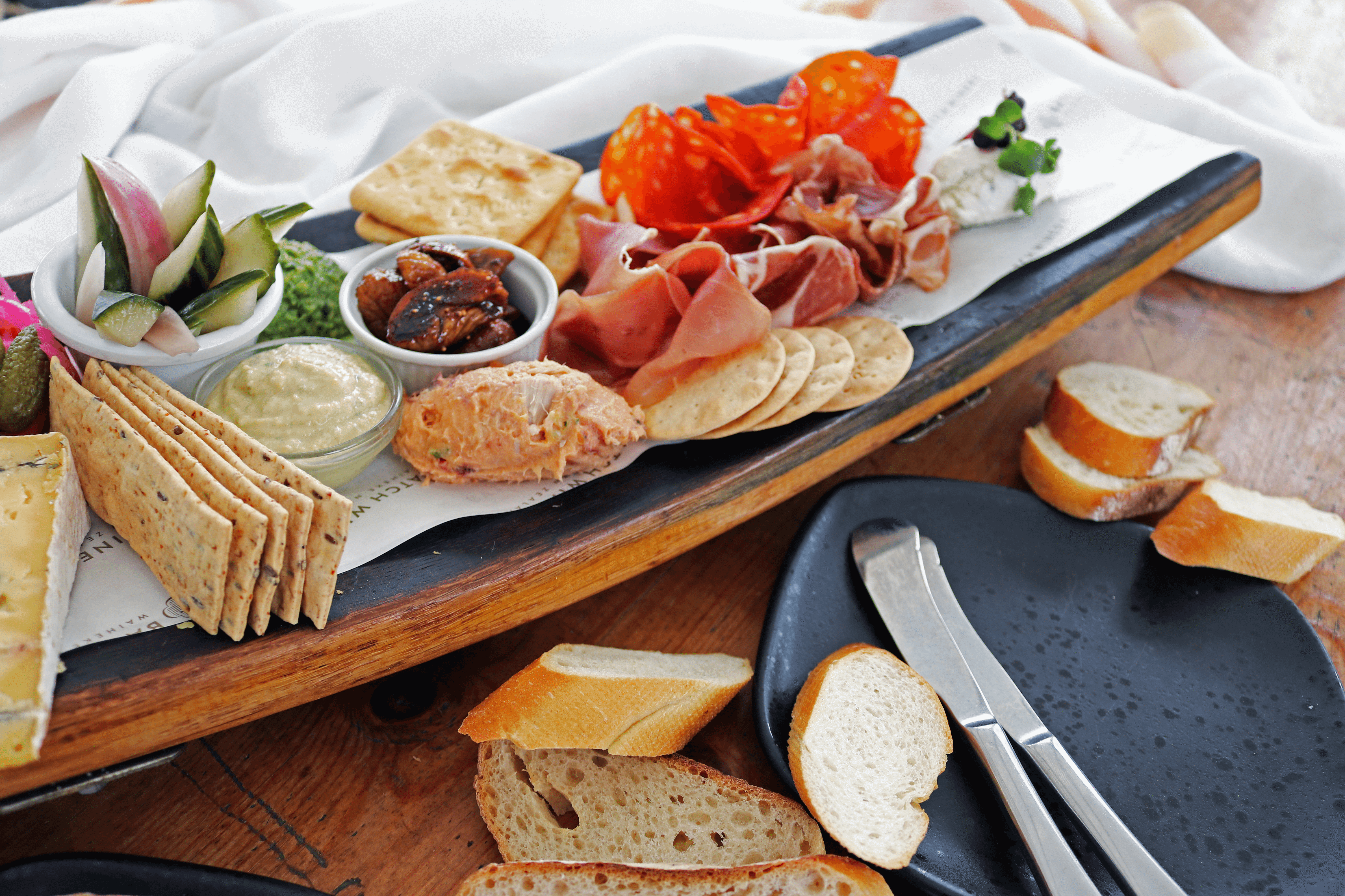Then, sit down either inside the restaurant, or picnic style outside & enjoy a delicious Batch platter while you soak in beautiful views over the Waitemata Harbour toward Auckland city. The Batch Platter typically consists of: